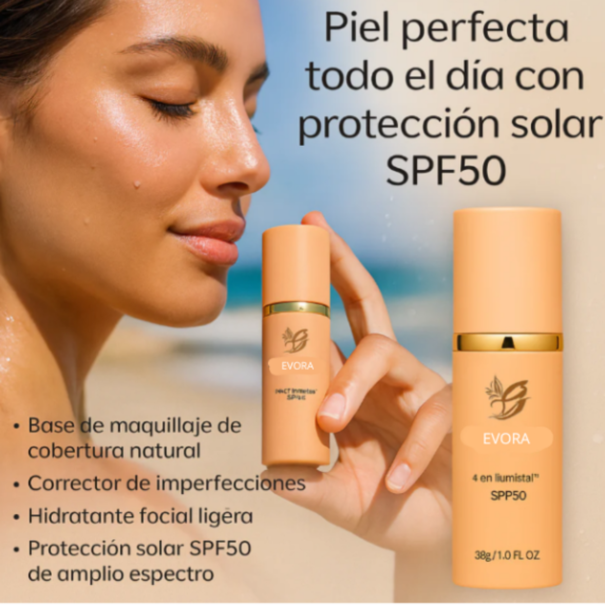 Despídete de las bases que fallan con EVORA 4 en 1 SPF50+, luce una piel perfecta, protegida y radiante todo el día